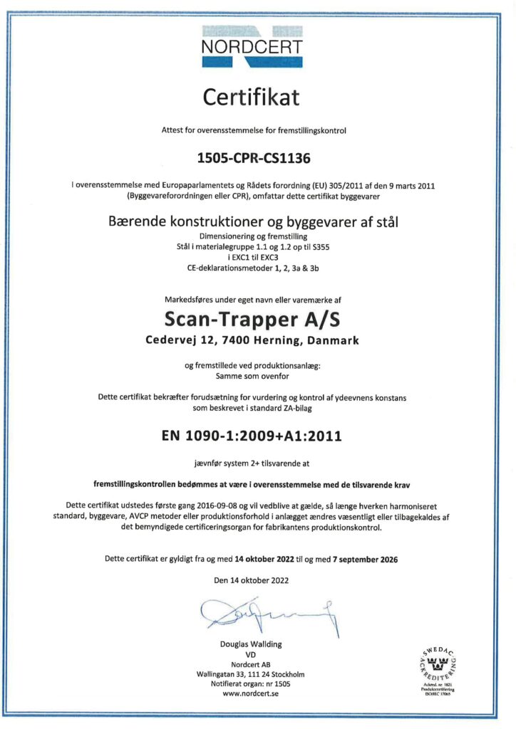 Scan Trapper er certificeret iht. EN1090-1 og må derfor CE mærke de leverede produkter. CE mærkningen er et lovkrav fra 1/7 2014 for alle trappeproducenter. Scan Trapper A/S lever naturligvis op til de nye krav.